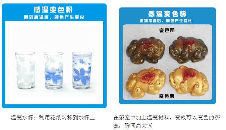 目前大多產品已經讓消費者產生了審美疲勞;沒有足夠的新品來吸引消費者;而溫變粉變色顏料則足夠給您產品帶來新穎;如圖上的變色杯子、變色茶寵、變色貼紙等;現在的產品都是大同小異;但加上變色材料后,瞬間可以秒殺其他同款休閑包,這就是變色的魅力。買溫變粉就到廣州頂凡溫變粉生產廠家。電話:13378693789、020-29862888 周先生